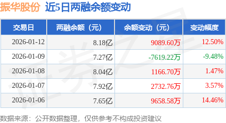证券之星消息,1月12日,振华股份(603067)融资买入2.72亿元,融资偿还1.81亿元,融资净买入9087.79万元,融资余额8.18亿元,近20个交易日中有11个交易日出现融资净买入。