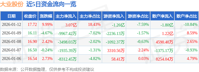 1月12日的资金流向数据方面,主力资金净流入3.07亿元,占总成交额18.43%,游资资金净流出1.26亿元,占总成交额7.59%,散户资金净流出1.8亿元,占总成交额10.84%。