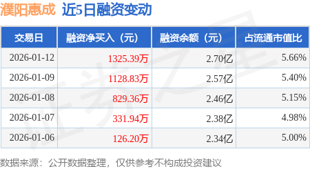 证券之星消息,1月12日,濮阳惠成(300481)融资买入4070.01万元,融资偿还2744.62万元,融资净买入1325.39万元,融资余额2.7亿元,近3个交易日已连续净买入累计3283.59万元。