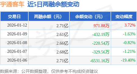 证券之星消息,1月12日,宇通客车(600066)融资买入4189.53万元,融资偿还3099.03万元,融资净买入1090.5万元,融资余额2.64亿元。