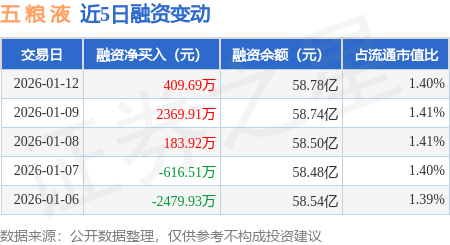 证券之星消息,1月12日,五 粮 液(000858)融资买入2.41亿元,融资偿还2.37亿元,融资净买入409.69万元,融资余额58.78亿元,近3个交易日已连续净买入累计2963.53万元。