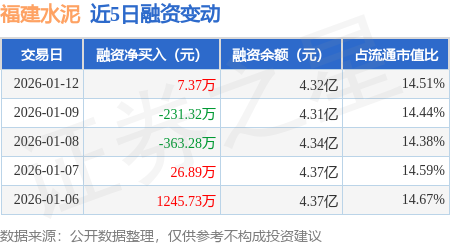 证券之星消息,1月12日,福建水泥(600802)融资买入845.12万元,融资偿还837.76万元,融资净买入7.37万元,融资余额4.32亿元。