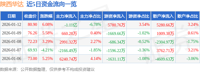 1月12日的资金流向数据方面,主力资金净流出1.11亿元,占总成交额6.78%,游资资金净流入5780.76万元,占总成交额3.54%,散户资金净流入5280.66万元,占总成交额3.24%。