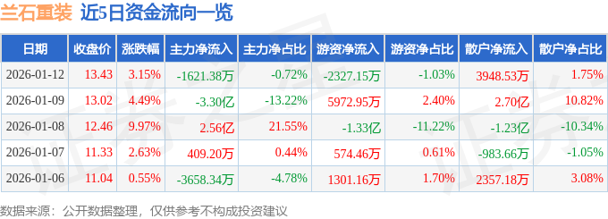 1月12日的资金流向数据方面,主力资金净流出1621.38万元,占总成交额0.72%,游资资金净流出2327.15万元,占总成交额1.03%,散户资金净流入3948.53万元,占总成交额1.75%。