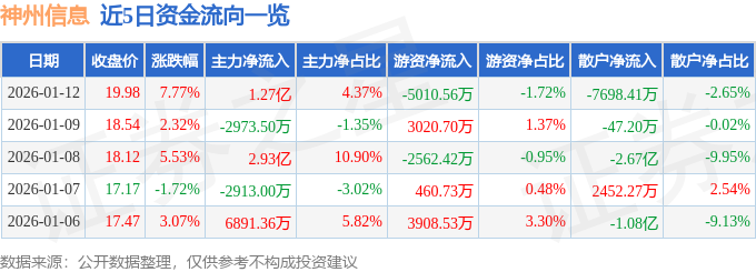 1月12日的资金流向数据方面,主力资金净流入1.27亿元,占总成交额4.37%,游资资金净流出5010.56万元,占总成交额1.72%,散户资金净流出7698.41万元,占总成交额2.65%。