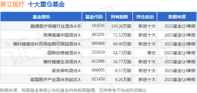 根据2025基金Q3季报公募基金重仓股数据,重仓该股的公募基金共7家,其中持有数量最多的公募基金为融通基金的融通医疗保健行业混合A/B。融通医疗保健行业混合A/B目前规模为7.08亿元,最新净值1.764(1月12日),较上一交易日上涨0.0%,近一年上涨22.93%。该公募基金现任基金经理为万民远 刘曦阳。万民远在任的基金产品包括:融通健康产业灵活配置混合A/B,管理时间为2016年8月26日至今,期间收益率为151.28%;融通鑫新成长混合A,管理时间为2021年10月8日至今,期间收益率为36.07%;融通价值成长混合A,管理时间为2022年7月18日至今,期间收益率为34.26%;