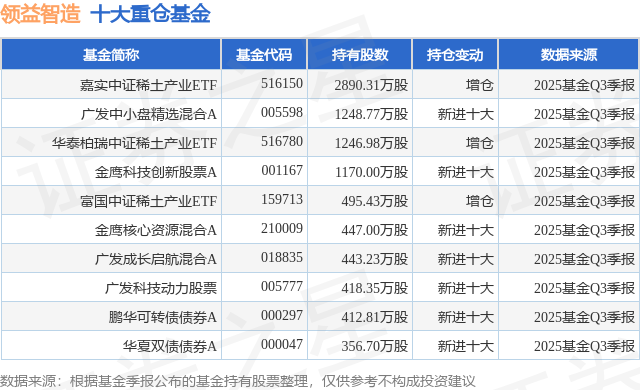 根据2025基金Q3季报公募基金重仓股数据,重仓该股的公募基金共26家,其中持有数量最多的公募基金为嘉实基金的嘉实中证稀土产业ETF。嘉实中证稀土产业ETF目前规模为76.48亿元,最新净值2.1026(1月12日),较上一交易日上涨3.89%,近一年上涨108.96%。该公募基金现任基金经理为田光远。田光远在任的基金产品包括:嘉实中证软件服务ETF,管理时间为2021年6月4日至今,期间收益率为-9.43%;嘉实中证电池主题ETF,管理时间为2021年7月13日至今,期间收益率为-11.79%;嘉实中证稀土产业ETF联接A,管理时间为2021年8月3日至今,期间收益率为39.08%。