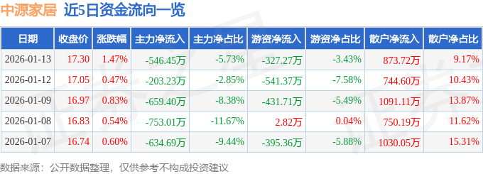 证券之星消息,截至2026年1月13日收盘,中源家居(603709)报收于17.3元,上涨1.47%,换手率4.43%,成交量5.55万手,成交额9529.26万元。