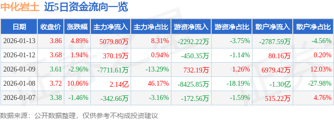 证券之星消息,截至2026年1月13日收盘,中化岩土(002542)报收于3.86元,上涨4.89%,换手率9.24%,成交量162.45万手,成交额6.11亿元。