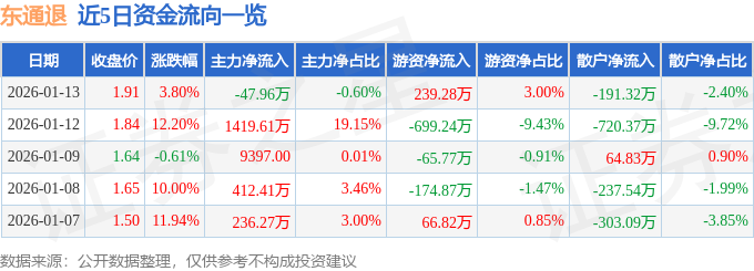 证券之星消息,截至2026年1月13日收盘,东通退(300379)报收于1.91元,上涨3.8%,换手率8.12%,成交量42.78万手,成交额7987.28万元。