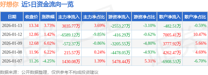 1月13日的资金流向数据方面,主力资金净流入3035.77万元,占总成交额3.69%,游资资金净流出2553.27万元,占总成交额3.1%,散户资金净流出482.51万元,占总成交额0.59%。