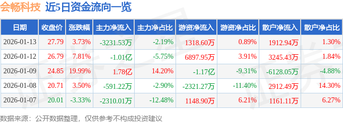 证券之星消息,截至2026年1月13日收盘,会畅科技(300578)报收于27.79元,上涨3.73%,换手率27.27%,成交量54.04万手,成交额14.74亿元。