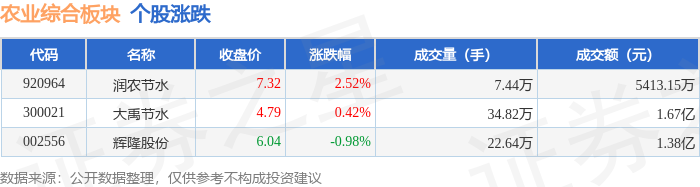 证券之星消息,1月13日农业综合板块较上一交易日下跌0.4%,辉隆股份领跌。当日上证指数报收于4138.76,下跌0.64%。深证成指报收于14169.4,下跌1.37%。农业综合板块个股涨跌见下表: