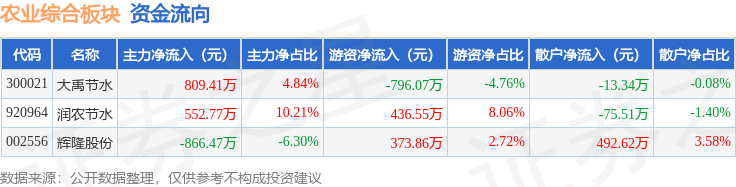 从资金流向上来看,当日农业综合板块主力资金净流出57.07万元,游资资金净流出422.21万元,散户资金净流入479.28万元。农业综合板块个股资金流向见下表: