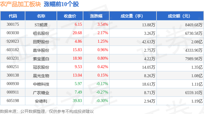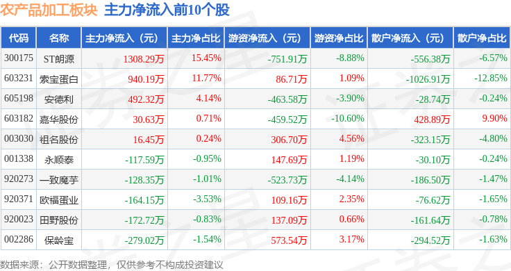 从资金流向上来看,当日农产品加工板块主力资金净流出3.24亿元,游资资金净流入8955.06万元,散户资金净流入2.34亿元。农产品加工板块个股资金流向见下表: