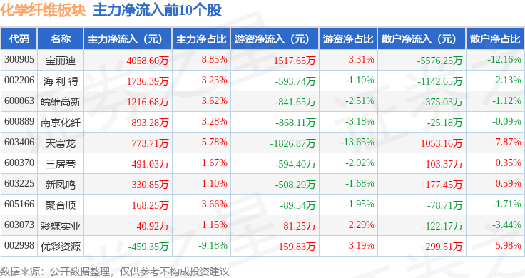 从资金流向上来看,当日化学纤维板块主力资金净流出4.55亿元,游资资金净流入3224.61万元,散户资金净流入4.23亿元。化学纤维板块个股资金流向见下表: