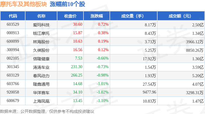 证券之星消息,1月13日摩托车及其他板块较上一交易日下跌1.46%,征和工业领跌。当日上证指数报收于4138.76,下跌0.64%。深证成指报收于14169.4,下跌1.37%。摩托车及其他板块个股涨跌见下表: