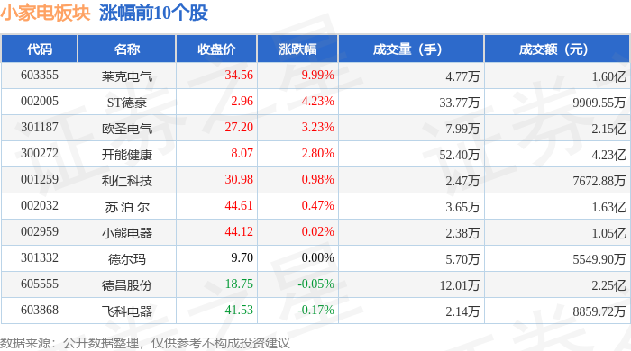 证券之星消息,1月13日小家电板块较上一交易日下跌0.19%,倍益康领跌。当日上证指数报收于4138.76,下跌0.64%。深证成指报收于14169.4,下跌1.37%。小家电板块个股涨跌见下表:
