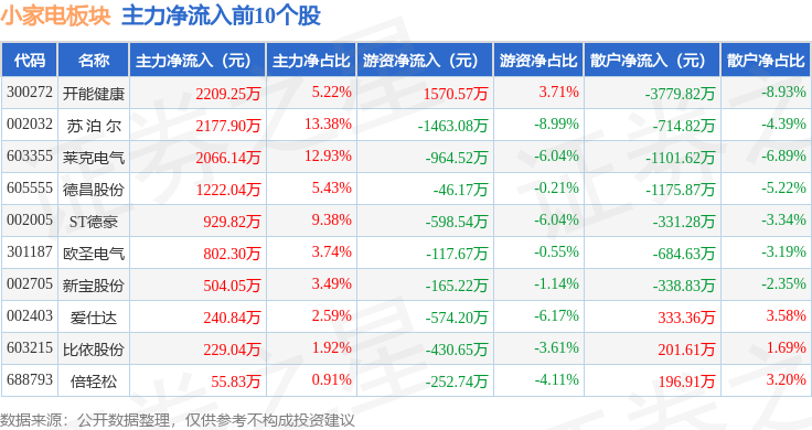 从资金流向上来看,当日小家电板块主力资金净流出4482.82万元,游资资金净流入7461.08万元,散户资金净流出2978.26万元。小家电板块个股资金流向见下表: