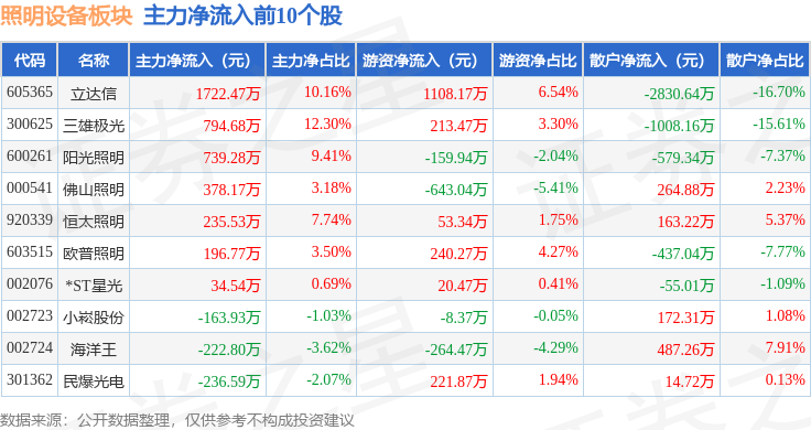 从资金流向上来看,当日照明设备板块主力资金净流入378.44万元,游资资金净流入4087.25万元,散户资金净流出4465.69万元。照明设备板块个股资金流向见下表: