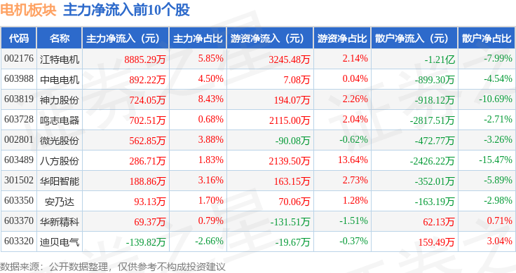 从资金流向上来看,当日电机板块主力资金净流出13.29亿元,游资资金净流入2.77亿元,散户资金净流入10.52亿元。电机板块个股资金流向见下表: