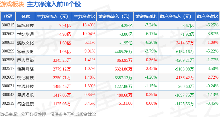 从资金流向上来看,当日游戏板块主力资金净流出11.92亿元,游资资金净流入2.43亿元,散户资金净流入9.49亿元。游戏板块个股资金流向见下表: