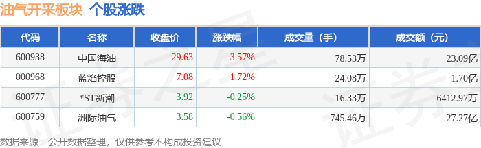 证券之星消息,1月13日油气开采板块较上一交易日上涨2.28%,中国海油领涨。当日上证指数报收于4138.76,下跌0.64%。深证成指报收于14169.4,下跌1.37%。油气开采板块个股涨跌见下表: