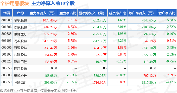 从资金流向上来看,当日个护用品板块主力资金净流入1719.79万元,游资资金净流入301.52万元,散户资金净流出2021.31万元。个护用品板块个股资金流向见下表: