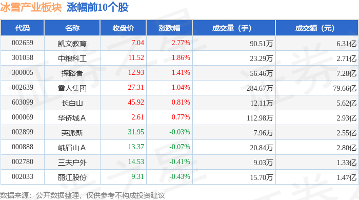 从资金流向上来看,当日冰雪产业板块主力资金净流出1.13亿元,游资资金净流出3.62亿元,散户资金净流入4.76亿元。冰雪产业板块个股资金流向见下表: