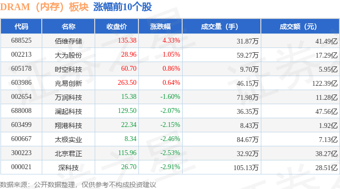 从资金流向上来看,当日DRAM(内存)板块主力资金净流出30.38亿元,游资资金净流入6.79亿元,散户资金净流入23.6亿元。DRAM(内存)板块个股资金流向见下表: