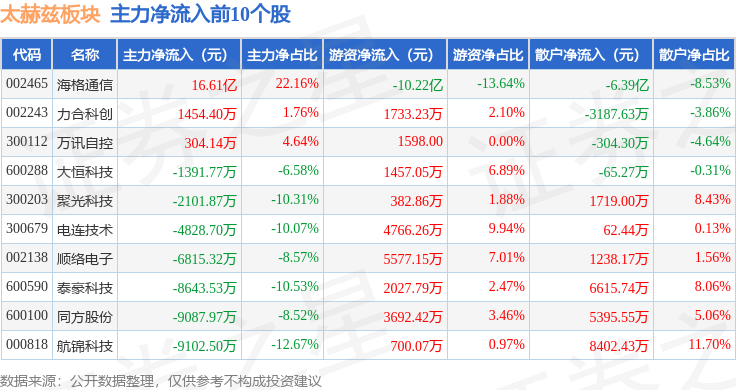 从资金流向上来看,当日太赫兹板块主力资金净流出66.19亿元,游资资金净流入17.25亿元,散户资金净流入48.94亿元。太赫兹板块个股资金流向见下表: