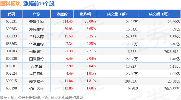 证券之星消息,1月13日眼科板块较上一交易日上涨0.72%,荣昌生物领涨。当日上证指数报收于4138.76,下跌0.64%。深证成指报收于14169.4,下跌1.37%。眼科板块个股涨跌见下表: