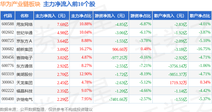 从资金流向上来看,当日华为产业链板块主力资金净流出501.73亿元,游资资金净流入101.91亿元,散户资金净流入399.82亿元。华为产业链板块个股资金流向见下表: