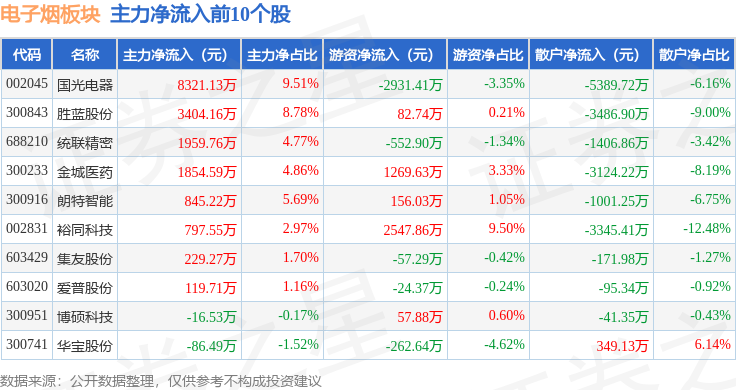 从资金流向上来看,当日电子烟板块主力资金净流出50.76亿元,游资资金净流入15.85亿元,散户资金净流入34.9亿元。电子烟板块个股资金流向见下表: