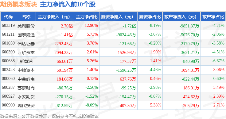 从资金流向上来看,当日期货概念板块主力资金净流出6.02亿元,游资资金净流入1054.41万元,散户资金净流入5.92亿元。期货概念板块个股资金流向见下表: