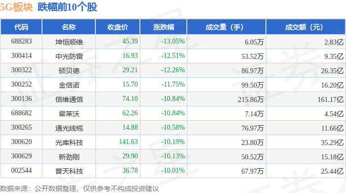 证券之星消息,1月13日5G板块较上一交易日下跌3.14%,坤恒顺维领跌。当日上证指数报收于4138.76,下跌0.64%。深证成指报收于14169.4,下跌1.37%。5G板块个股涨跌见下表: