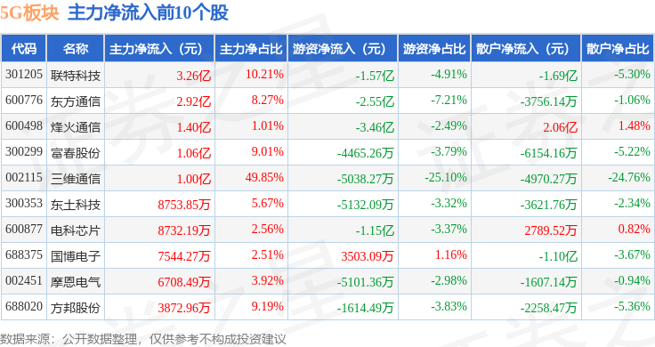 从资金流向上来看,当日5G板块主力资金净流出374.55亿元,游资资金净流入102.67亿元,散户资金净流入271.88亿元。5G板块个股资金流向见下表: