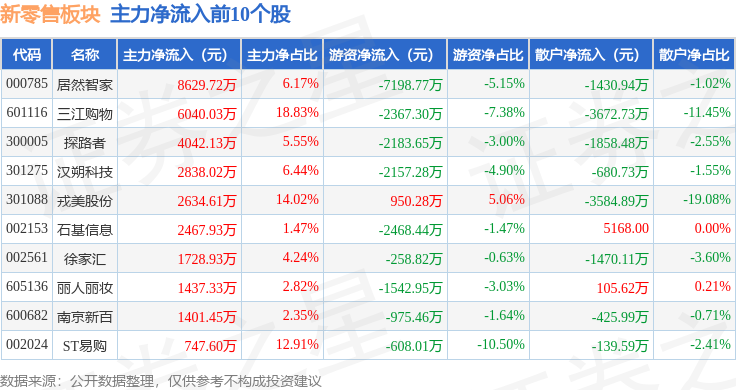 从资金流向上来看,当日新零售板块主力资金净流出32.85亿元,游资资金净流出3.3亿元,散户资金净流入36.15亿元。新零售板块个股资金流向见下表: