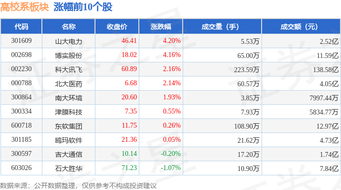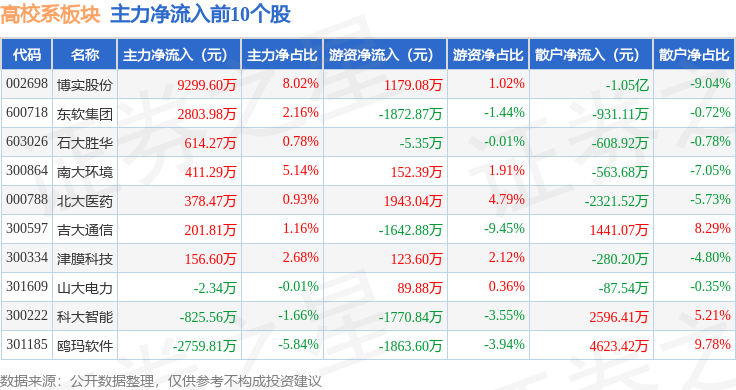 从资金流向上来看,当日高校系板块主力资金净流出19.17亿元,游资资金净流入8.55亿元,散户资金净流入10.63亿元。高校系板块个股资金流向见下表: