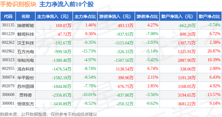 从资金流向上来看,当日手势识别板块主力资金净流出16.34亿元,游资资金净流入3.19亿元,散户资金净流入13.15亿元。手势识别板块个股资金流向见下表: