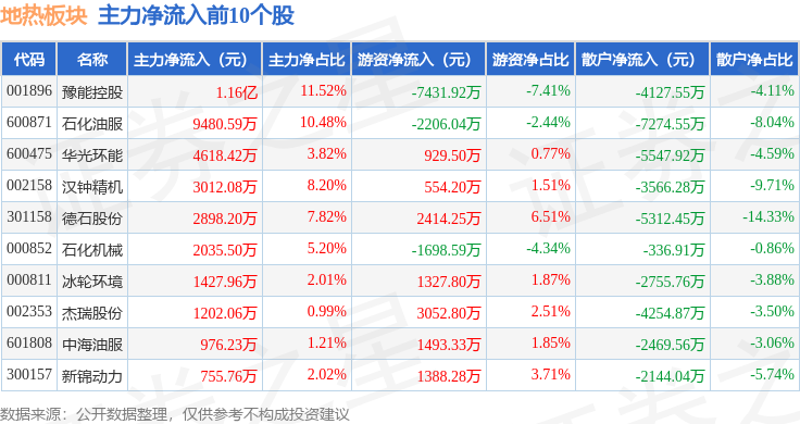 从资金流向上来看,当日地热板块主力资金净流入9187.2万元,游资资金净流出3.33亿元,散户资金净流入2.41亿元。地热板块个股资金流向见下表:
