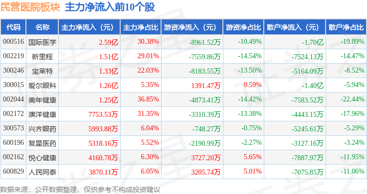 从资金流向上来看,当日民营医院板块主力资金净流出5700.39万元,游资资金净流出7869.6万元,散户资金净流入1.36亿元。民营医院板块个股资金流向见下表: