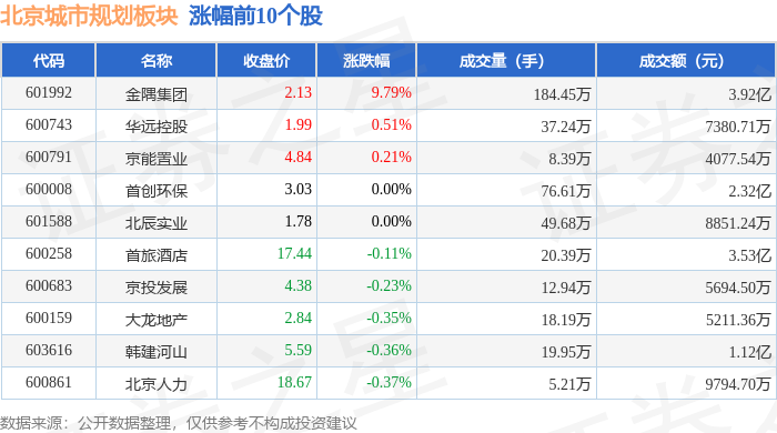证券之星消息,1月13日北京城市规划板块较上一交易日下跌2.06%,城建发展领跌。当日上证指数报收于4138.76,下跌0.64%。深证成指报收于14169.4,下跌1.37%。北京城市规划板块个股涨跌见下表: