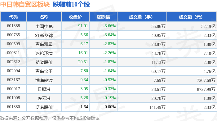 证券之星消息,1月13日中日韩自贸区板块较上一交易日下跌2.8%,中国中免领跌。当日上证指数报收于4138.76,下跌0.64%。深证成指报收于14169.4,下跌1.37%。中日韩自贸区板块个股涨跌见下表: