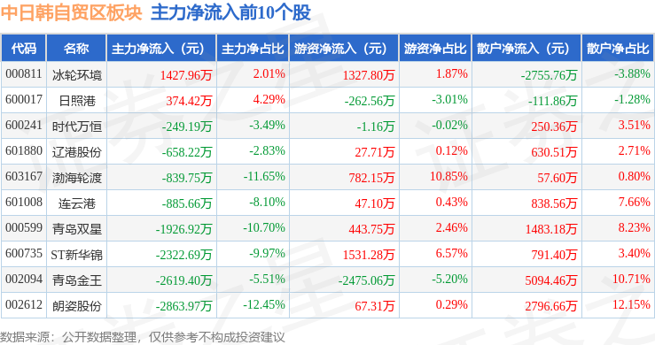 从资金流向上来看,当日中日韩自贸区板块主力资金净流出8.79亿元,游资资金净流入2.7亿元,散户资金净流入6.09亿元。中日韩自贸区板块个股资金流向见下表: