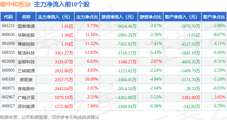从资金流向上来看,当日碳中和板块主力资金净流出44.15亿元,游资资金净流入7.66亿元,散户资金净流入36.49亿元。碳中和板块个股资金流向见下表: