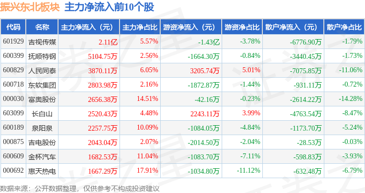 从资金流向上来看,当日振兴东北板块主力资金净流出18.42亿元,游资资金净流入3.69亿元,散户资金净流入14.72亿元。振兴东北板块个股资金流向见下表: