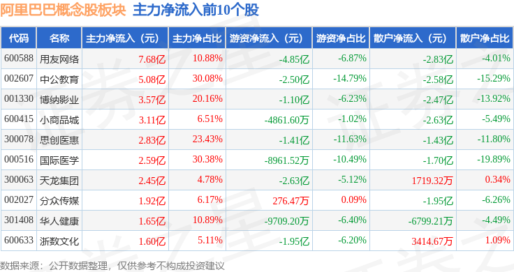从资金流向上来看,当日阿里巴巴概念股板块主力资金净流出207.69亿元,游资资金净流入31.8亿元,散户资金净流入175.89亿元。阿里巴巴概念股板块个股资金流向见下表: