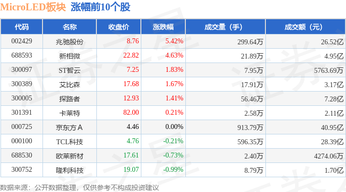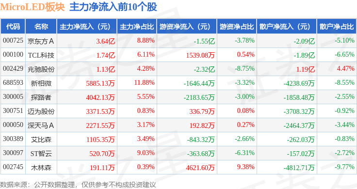 从资金流向上来看,当日MicroLED板块主力资金净流出25.38亿元,游资资金净流入3.6亿元,散户资金净流入21.78亿元。MicroLED板块个股资金流向见下表:
