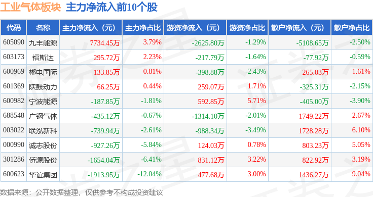 从资金流向上来看,当日工业气体板块主力资金净流出18.32亿元,游资资金净流入5.49亿元,散户资金净流入12.83亿元。工业气体板块个股资金流向见下表: